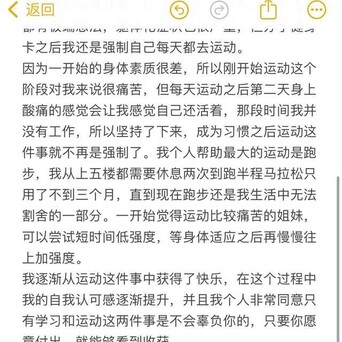 我逐渐从运动这件事中获得了快乐,在这个过程中我的自我认可感逐渐提升,并且我个人非常同意只有学习和运动这两件事是不会辜负你的,只要你愿意付出,就能够看到收获。
