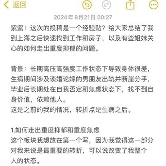 紫紫!这次的投稿是一个经验贴?给大家总结了我到上海之后快速找到工作和房子,以及有些姐妹关心的如何走出重度抑郁的问题。