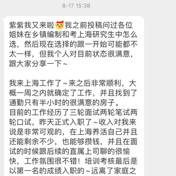 是之前问大家在乡镇编制和考上海研究生中怎么选,最后选择了去上海工作并且过得很开心的姐妹的后续分享。